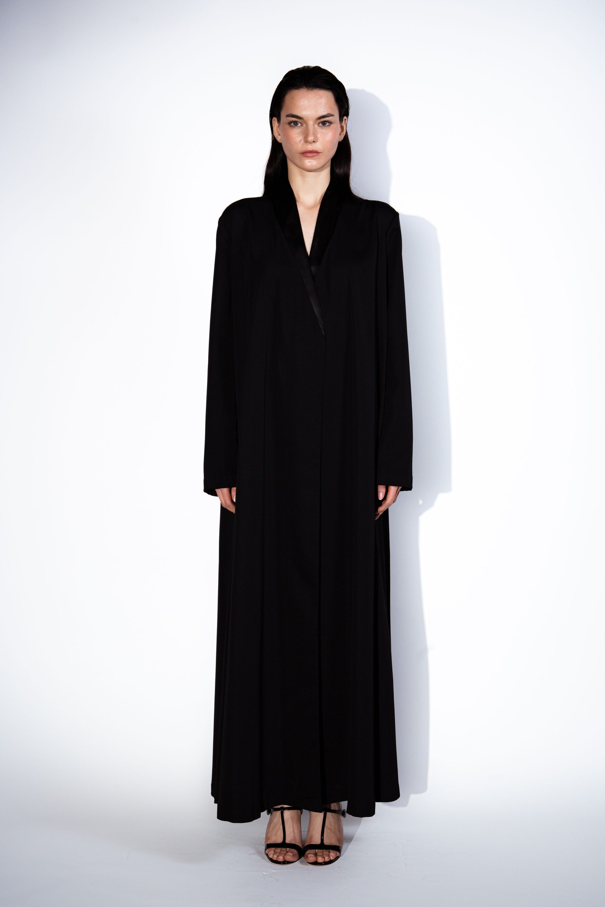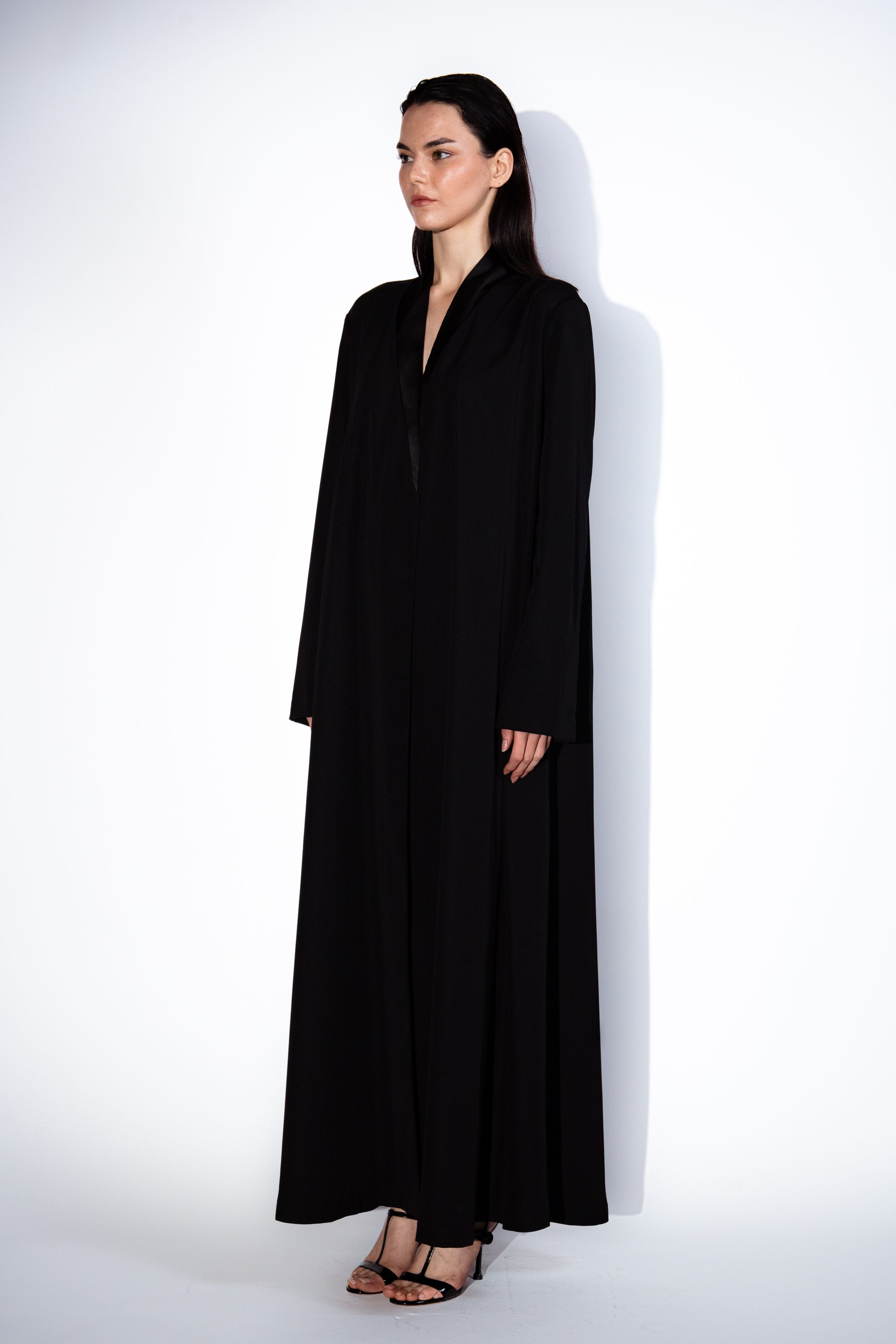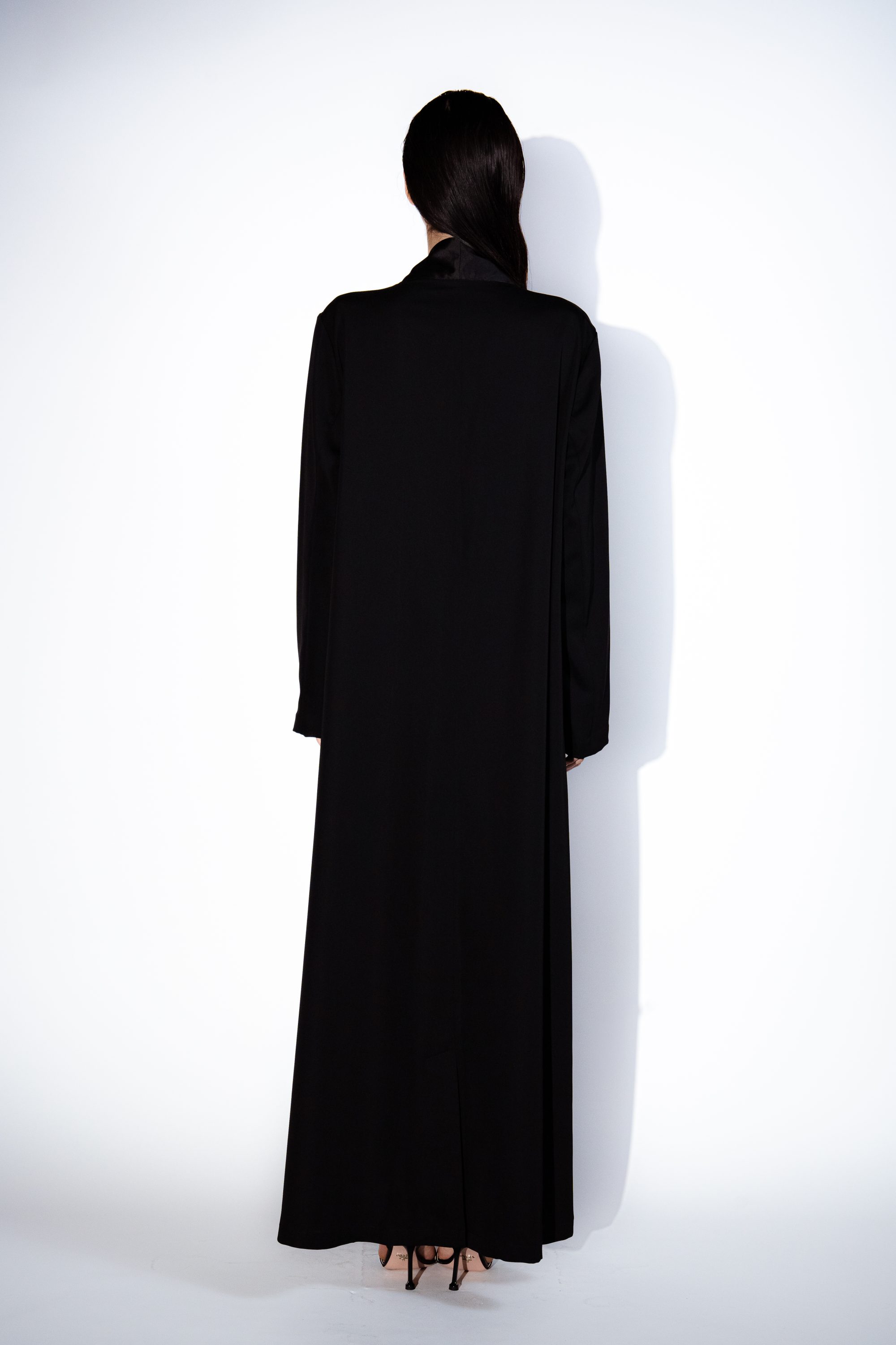 Elegant and refined A cut Abaya with high neck line and organza accent – back slit, flows gracefully and enhances femininity